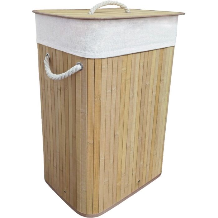 Der Wäschekorb hat folgende Maße: Höhe: 60 cm, Breite: 40 cm, Tiefe: 30 cm. Das Material besteht vollständig aus Bambusholz mit einem Baumwoll-Innenbeutel.