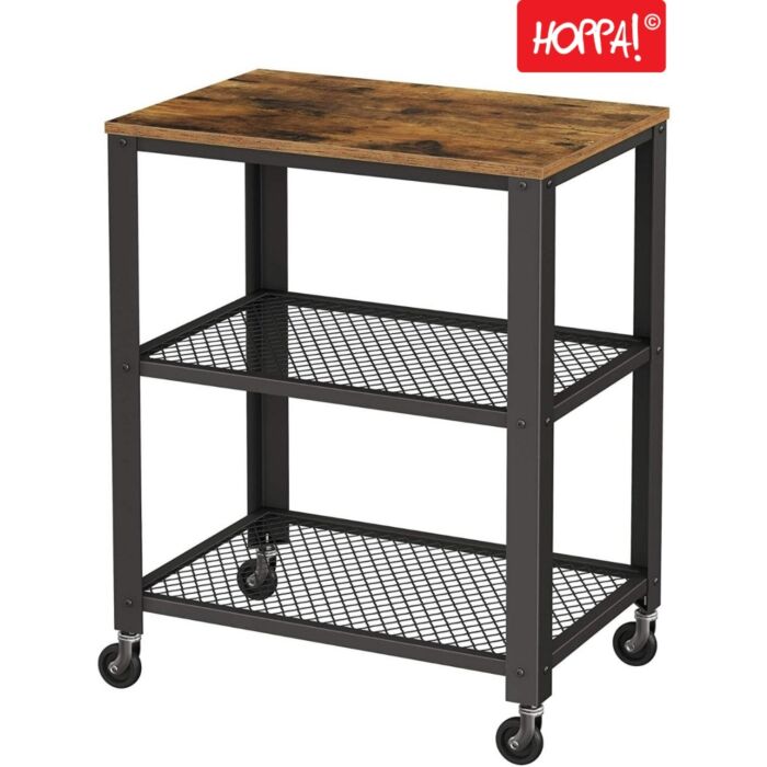 Aus hochwertigem Material gefertigt, ist dieser Hoppa! Beistelltisch aus Holz in Schwarz ein praktischer und langlebiger Begleiter im Haushalt. Mit einem vielseitigen Regal und Rädern ausgestattet, bietet er eine großartige Lösung, um alles von Büchern bis zu Küchenutensilien organisiert und griffbereit zu halten. Der industrielle Stil verleiht ihm ein attraktives und modernes Aussehen, das gut zu verschiedenen Einrichtungsstilen passt. Ob in der Küche, im Wohnzimmer oder im Schlafzimmer, dieser Beistelltisch bietet sich als funktionale und dekorative Ergänzung an.