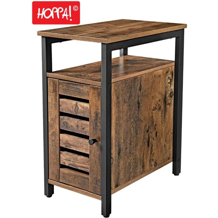 Hoppa! Beistelltisch/Beistelltisch in Braun/Schwarz mit einer Größe von 30 x 50 x 60 cm ist ein stilvolles und funktionales Möbelstück für Ihr Zuhause oder Büro. Die Lamellentür verbirgt ein geräumiges Fach, während die obere Ablagefläche Platz für Dekorationen wie Vasen oder Souvenirs bietet. Das darunterliegende Regal eignet sich ideal für Magazine oder Bücher. Der Tisch aus Metall ist einfach aufzubauen und verfügt über verstellbare Beine für Stabilität. Bei Fragen steht Ihnen unser Kundenservice gerne zur Verfügung.