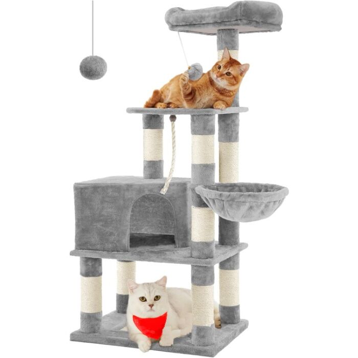 Die verschiedenen Ebenen des Kratzbaums bieten Ihrer Katze einen abwechslungsreichen Spielplatz zum Klettern und Spielen. Die Kratzmatte aus Natursisal und die inkludierten Spielzeuge sorgen für zusätzliche Spaßmomente und fördern die Bewegung Ihrer Katze.