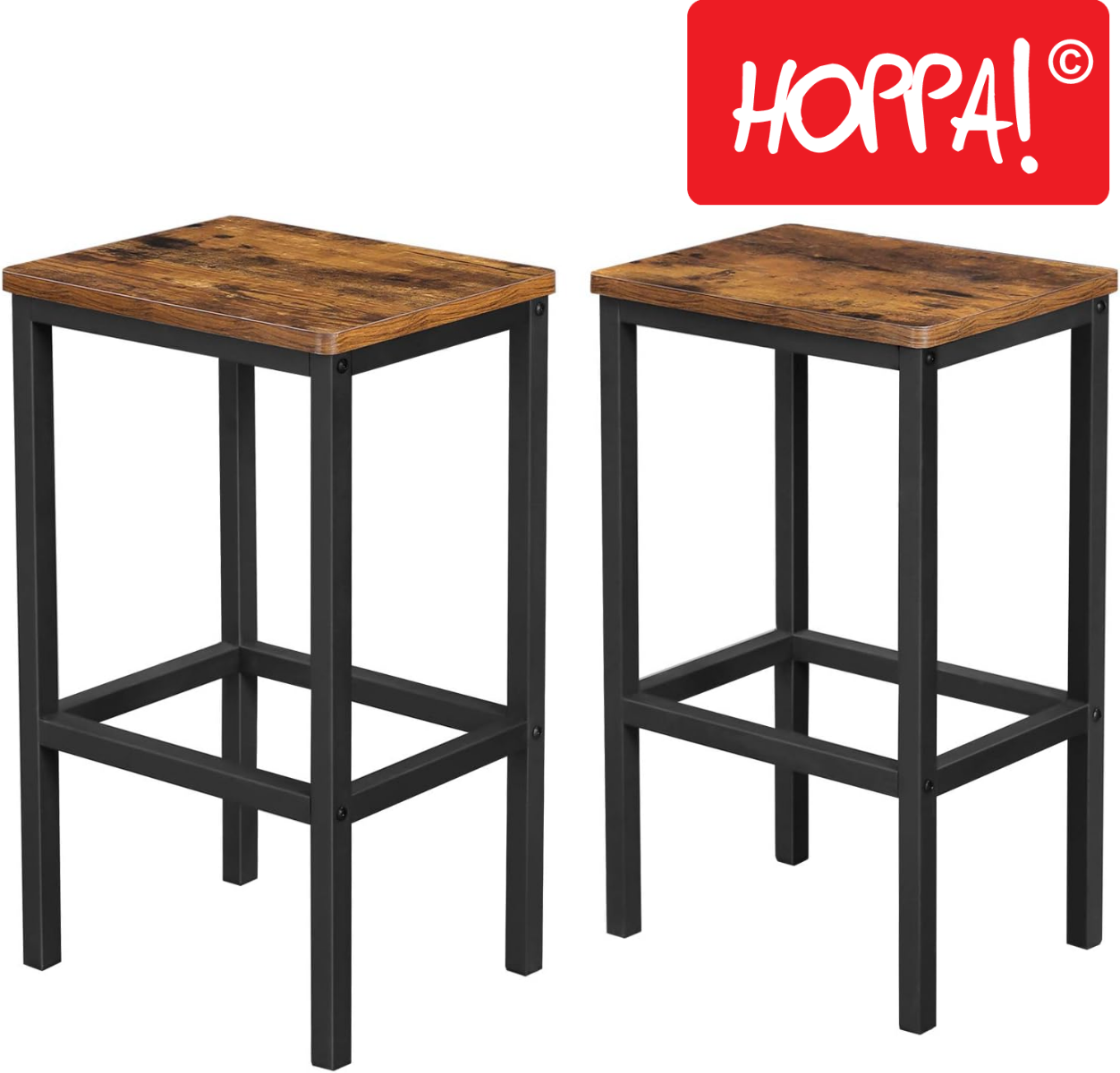 Entdecken Sie das Hoppa! Set von 2 Barkrukken, die nicht nur stilvoll, sondern auch funktional sind. Mit einer vintage Holzoptik und einem robusten, schwarzen Eisenrahmen sind diese Stühle eine ideale Ergänzung für Ihre Küche, Wohnzimmer oder Kellerbar. Die Kombination aus Holz und Metall verleiht jedem Raum einen modernen Akzent.