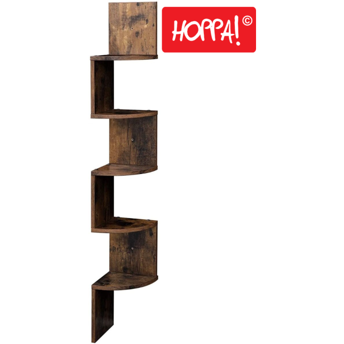 Das Hoppa! Eckregal in Braun und Holz ist eine elegante Lösung, um Ihre Bücher zu organisieren oder Dekorationsartikel stilvoll zu präsentieren. Mit einem Abstand von 20 cm zwischen den Ebenen bietet das Regal mit 5 Ebenen ausreichend Platz für Blumentöpfe, Spielzeug und Dekorationen. Jede Ebene kann bis zu 15 kg tragen, dank der robusten 15 mm dicken Spanplatte und stabilen Ankern für hohe Stabilität. Die Melaminfurnieroberfläche sorgt für Kratz- und Verschleißfestigkeit. Die einzigartige Zickzack-Form und abgerundeten Fachböden machen das Regal ästhetisch ansprechend und kinderfreundlich. Ideal für den Einsatz im Wohnzimmer, Schlafzimmer oder Arbeitszimmer.