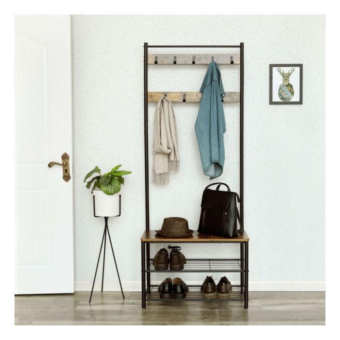 Der Kleiderständer hat die Abmessungen 70 x 32 x 175 cm (L x B x H) und verfügt über 2 Gitterböden für Ihre Schuhe. Das Produkt ist in Vintage-Braun und Schwarz gehalten und besteht aus hochwertiger Spanplatte und Stahl.