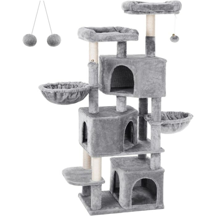 Dieser große Kratzbaum bietet eine vielseitige Spiel- und Ruhelandschaft mit mehreren Ebenen, Höhlen und Plattformen. Durch das clevere Design können Katzen jeden Alters mühelos nach oben klettern. Die neutrale graue Farbe passt perfekt in jedes Wohnambiente, während die stabile Bauweise für eine lange Lebensdauer sorgt.