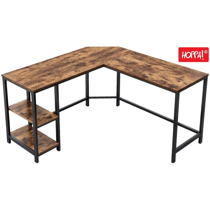 Der Hoppa! L-förmige Schreibtisch mit Regalen in Schwarz/Braun aus Metall vereint Stil und Funktionalität. Dieser Computertisch besticht durch sein stabiles Metallgestell, kombiniert mit einer ansprechenden Vintage-Look Tischplatte.