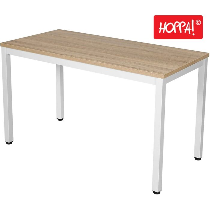Der Hoppa! Metalltisch in Weiß/Buche besticht durch seine zeitlose Eleganz und Vielseitigkeit. Die Tischplatte mit der natürlichen Holzmaserung harmoniert perfekt mit dem robusten weißen Metallrahmen, wodurch dieser Tisch mühelos in jede Einrichtung integriert werden kann. Ob als Schreibtisch, Computertisch, Esstisch oder als stilvolles Möbelstück in Ihrem Wohnraum – dieser Tisch erfüllt höchste Ansprüche an Design und Funktionalität.