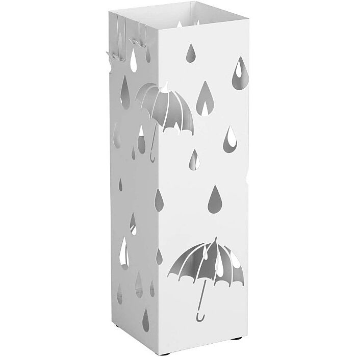 Der Regenschirmhalter hat die Maße 15,5 x 15,5 x 49 cm und besteht aus robustem Stahlblech. Die weiße Farbe sorgt für eine moderne und saubere Ausstrahlung, die sich nahtlos in jeden Einrichtungsstil einfügt.