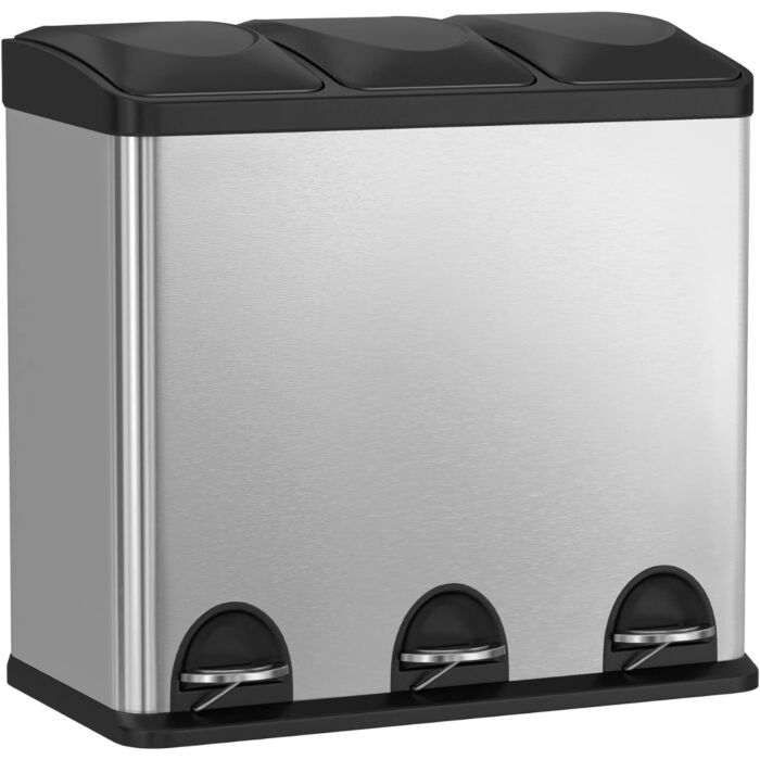 Dieser Edelstahl-Abfallbehälter zeichnet sich durch ein durchdachtes Design aus. Ausgestattet mit einem praktischen Pedalmechanismus, öffnet sich der Deckel hygienisch und mühelos auf Knopfdruck, was eine komfortable Nutzung garantiert. Die drei Inneneimer ermöglichen eine einfache Abfalltrennung und fördern damit das Recycling.