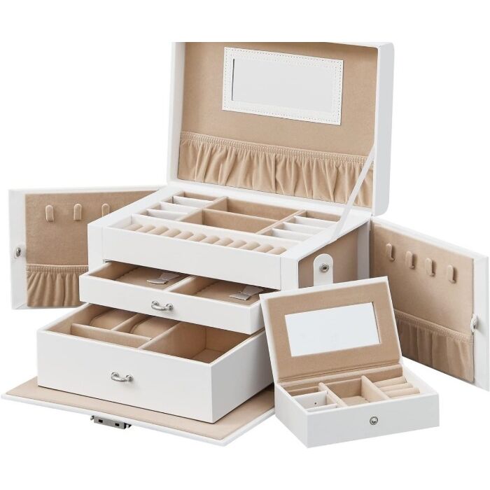 Öffnen Sie die Schatulle und lassen Sie sich von der ordentlichen Anordnung von Ringen und Ohrringen begeistern. Dieses Schmuckkästchen wird Ihren Schmuck sicher und stilvoll aufbewahren, egal ob zu Hause oder unterwegs.