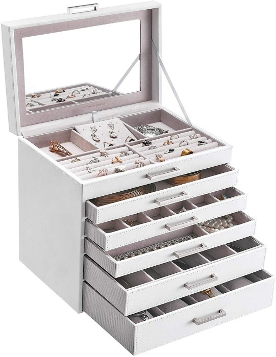 Die Songmics Sieradendoos ist die ideale Lösung für die Aufbewahrung Ihrer Schmuckstücke in einem stilvollen und funktionalen Design. Diese Schmuckbox hat insgesamt sechs Ebenen, die Ihnen ermöglichen, verschiedene Arten von Schmuck geordnet zu lagern. Der letzte Schublade ist ideal für bis zu acht Uhren, während die vorherigen Ebenen spezifisch für Brillen, Ketten und Ringe ausgelegt sind. Der Deckel der Box ist mit einem praktischen Spiegel ausgestattet, was sie zur perfekten Wahl für jedes Schlafzimmer oder Badezimmer macht.