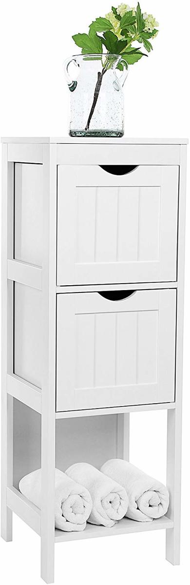 Die Badezimmerkommode besteht aus doppelseitig lackierten MDF-Platten und hat die Abmessungen 30 x 89 x 30 cm (BxHxT). Das offene Fach misst 27 x 24 x 29 cm (BxHxT) und die Schubladen bieten Innenmaße von 24,5 x 22 x 27 cm (BxHxT).