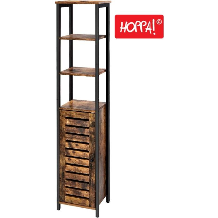 Dieser Hoppa! Schmaler Aufbewahrungsschrank aus Spanplatte in Braun/Schwarz ist die Lösung für alle, die sich nicht zwischen Küchenregal und Wohnzimmerschrank sowie Vintage- und Industriedesign entscheiden können. Mit 3 offenen und 2 versteckten Ablagen bietet er reichlich Stauraum für all Ihre Bedürfnisse. Der integrierte Schrank mit einer stilvollen Lamellentür öffnet sich sanft durch leichten Druck und beherbergt zwei höhenverstellbare Einlegeböden.