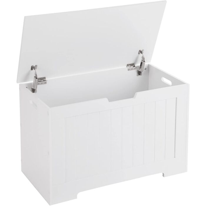 Die Spielzeugkiste misst 76 x 48 x 40 cm und besteht aus robustem Holz in elegantem Weiß lackiert.