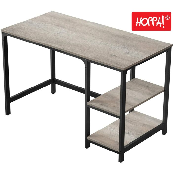 Der Hoppa! Computertisch vereint Stil und Selbstbewusstsein mit seiner einzigartigen Vintage-Optik und hochwertigen Verarbeitung. Die Kombination aus robustem Metall und kräftiger Spanplatte verleiht diesem Schreibtisch einen anmutigen Charme, der jeden Raum aufwertet. Mit einer geräumigen Tischplatte und zwei zusätzlichen Ablagen bietet dieser Schreibtisch ausreichend Platz für alle Ihre Unterlagen und Büroutensilien. Die Ablagen sind flexibel positionierbar, um Ihren individuellen Anforderungen gerecht zu werden. Die 1,2 mm starke Metallrahmenkonstruktion, die stabilen Oberflächen in Holzoptik und die verstellbaren Beine gewährleisten eine stabile Arbeitsumgebung ohne lästige Wackelbewegungen, selbst bei intensiver Nutzung. Die Montage des Schreibtisches gestaltet sich dank der detaillierten Anleitung und des mitgelieferten Werkzeugs unkompliziert und stressfrei. Genießen Sie eine produktive Arbeitsumgebung ohne Turbulenzen. Erhalten Sie mit dem Hoppa! Computertisch nicht nur einen funktionalen Arbeitsplatz, sondern auch ein stilvolles Möbelstück, das Ihre Einrichtung aufwertet. Entdecken Sie die ALINRU-Kollektion und bringen Sie stilvolle Eleganz in Ihr Büro.