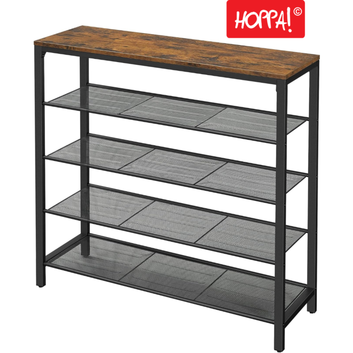 Die vier geräumigen Regale sind so konzipiert, dass sie eine Vielzahl von Schuhen aufnehmen können, darunter Sneakers, Sandalen und Stiefel. Jedes Regal hat eine Tragfähigkeit von bis zu 5 kg, während die oberste Ablage für die Ablage von Taschen und anderen Gegenständen geeignet ist. Das designvolle, industrielle Aussehen des Regals macht es zu einem echten Hingucker in jedem Flur.