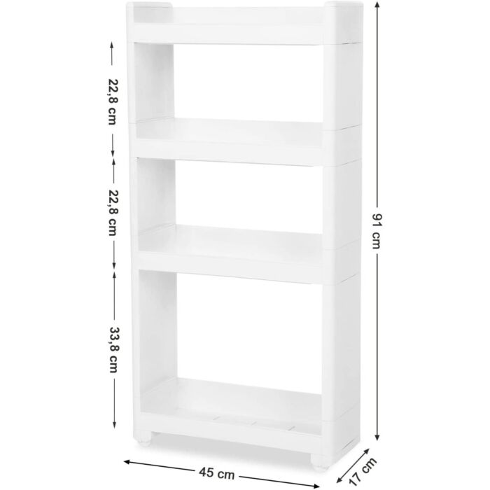 Der Hoppa! weiße Küchenwagen Kunststoff in 4-lagiger Ausführung bietet eine platzsparende Lösung, um zusätzlichen Stauraum in Küche, Bad oder Wohnzimmer zu schaffen. Mit seinem schlanken Design fügt sich das Nischenregal perfekt in ungenutzte Räume ein.