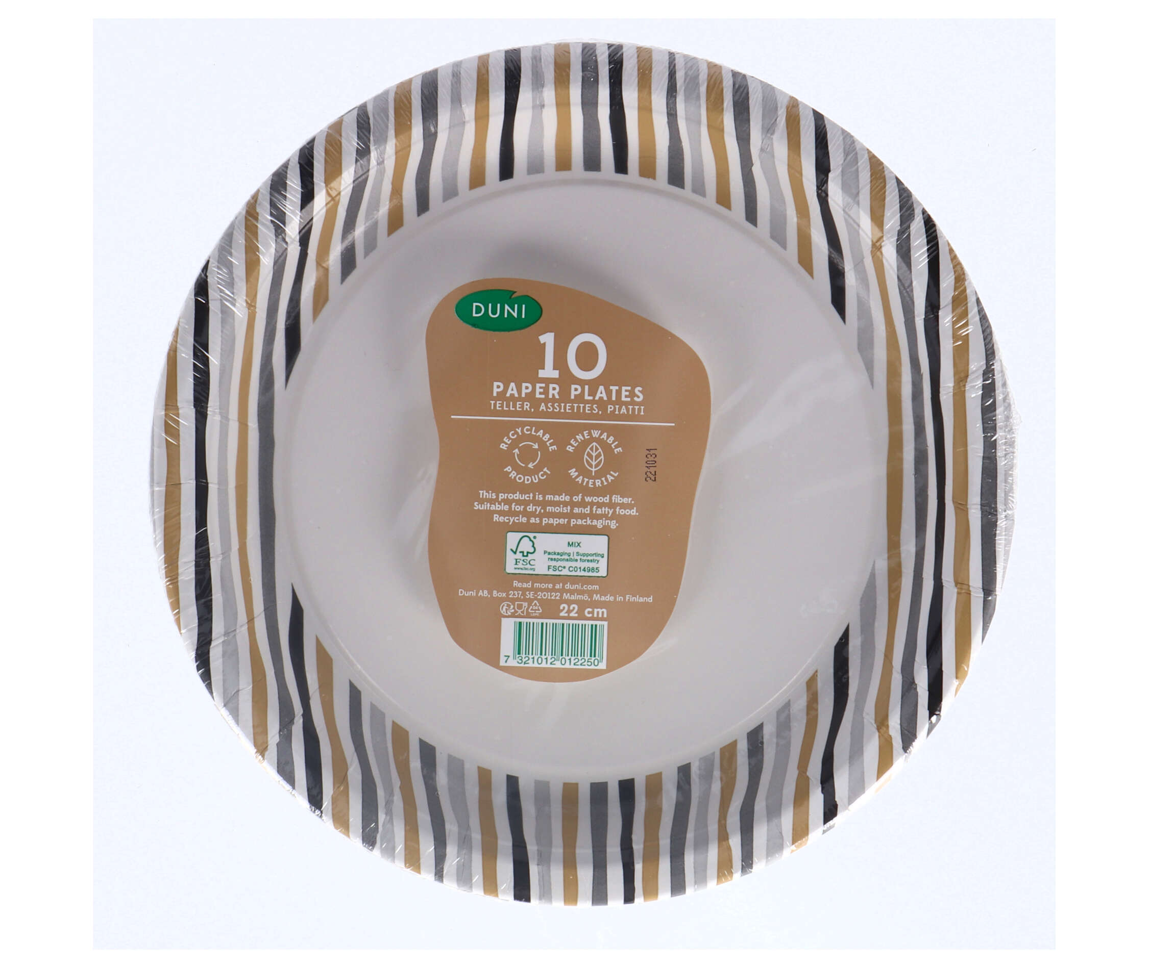 Die Teller mit gestreiftem Schwarz- und Golddesign sind eine stilvolle Ergänzung für jede Tischdekoration. Mit einem Durchmesser von 22 cm sind sie perfekt geeignet für Vorspeisen, Desserts oder Snacks und bringen Eleganz in jede Essenssituation. Das Set enthält 10 Teller, was es ideal für Feiern, Dinnerpartys oder den täglichen Gebrauch macht.