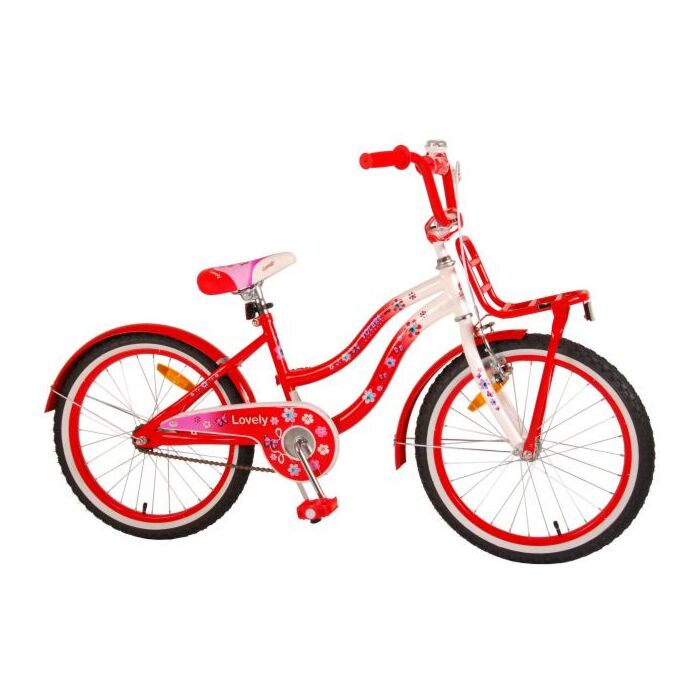 Volare Schönes 20 Zoll Kinderfahrrad. Das Volare Lovely 20 Zoll Kinderfahrrad ist das Fahrrad, von dem jedes Mädchen träumt. Die Schmetterlinge und Blumen an Rahmen und Sattel runden das Design des roten Fahrrads ab. Um langsamer zu werden, hat das Fahrrad sowohl eine Handbremse als auch eine Rücktrittbremse. Das Fahrrad hat einen etwas härteren Pistolenkettenschutz. Mit der Fahrradklingel können Sie uns mitteilen, dass Sie um die Ecke kommen. Auf dem praktischen Frontgepäckträger lassen sich alle wichtigen Utensilien mitnehmen. Durch die 20 Zoll Luftbereifung ist das Fahrrad für Kinder zwischen 6 und 8 Jahren mit Kleidergröße 116-122 geeignet.