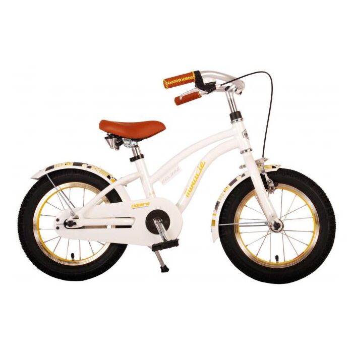 Radfahren lernen ist mit dem Volare Miracle 14 Zoll Kinderfahrrad ein Fest für jedes Kind! Das stilvolle Fahrrad in Weiß wurde speziell für Mädchen konzipiert und bietet eine Kombination aus Sicherheit, Komfort und Benutzerfreundlichkeit. Sicherheit geht vor, weshalb dieses coole Bike einen geschlossenen Kettenschutz hat, der die Finger des jungen Fahrers schützt. Zusätzlich gewährleisten die Reflektoren in den Pedalen eine verbesserte Sichtbarkeit im Straßenverkehr.