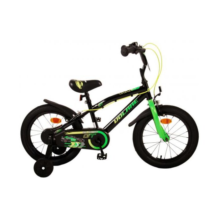 Die Volare Super GT 16 Zoll Kinderfahrrad ist die perfekte Wahl für kleine Radfahrer, die das Fahren erlernen möchten. Mit ihrem ansprechenden Design in Schwarz und grünen Akzenten macht das Fahren mit diesem Fahrrad gleich doppelt Spaß. Sicherheit hat oberste Priorität: Ausgestattet mit zwei Handbremsen, anstatt einer Rücktrittbremse, und einer geschlossenen Kettenabdeckung, garantiert dieses Fahrrad ein sicheres Fahrerlebnis. Die reflektierenden Elemente an den Rädern und an der Vorder- und Rückseite erhöhen die Sichtbarkeit im Straßenverkehr und sorgen für zusätzliche Sicherheit.